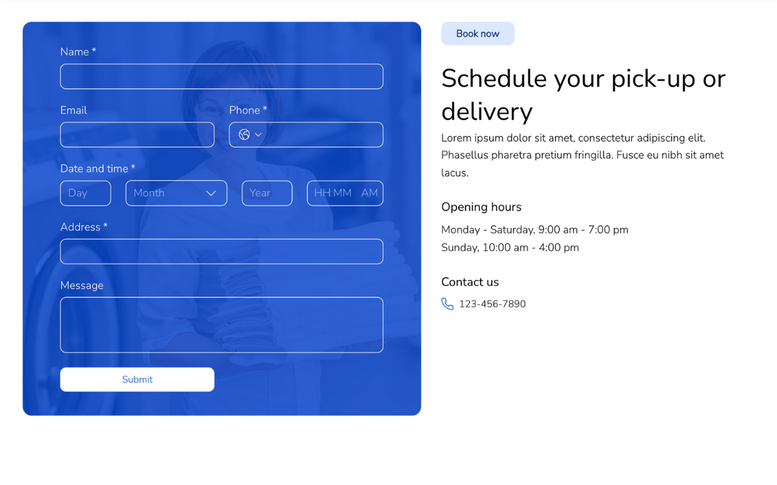 The services page provides detailed descriptions of the various laundry and dry-cleaning options available, making it easy for customers to choose the right service for their needs. Integrated with Wix Forms, the booking page allows clients to schedule pickups and deliveries seamlessly. The contact page includes all necessary information, an interactive map, and a simple contact form for inquiries. Laundry Service’s user-friendly features and modern design make it the ideal platform for laundry businesses looking to create a strong and reliable online presence.